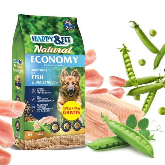 A Happy&Fit Economy Adult Hallal és Zöldségekkel teljesértékű szárazeledel, amely gazdag fehérjeforrásokat – szárított halat – kombinál a természetes rostokat biztosító zöldségekkel. A receptúra ideális mindennapi etetéshez, segíti a kutyák energiaszintjének fenntartását, miközben támogatja az emésztést, az egészséges szőrzetet és az általános vitalitást.